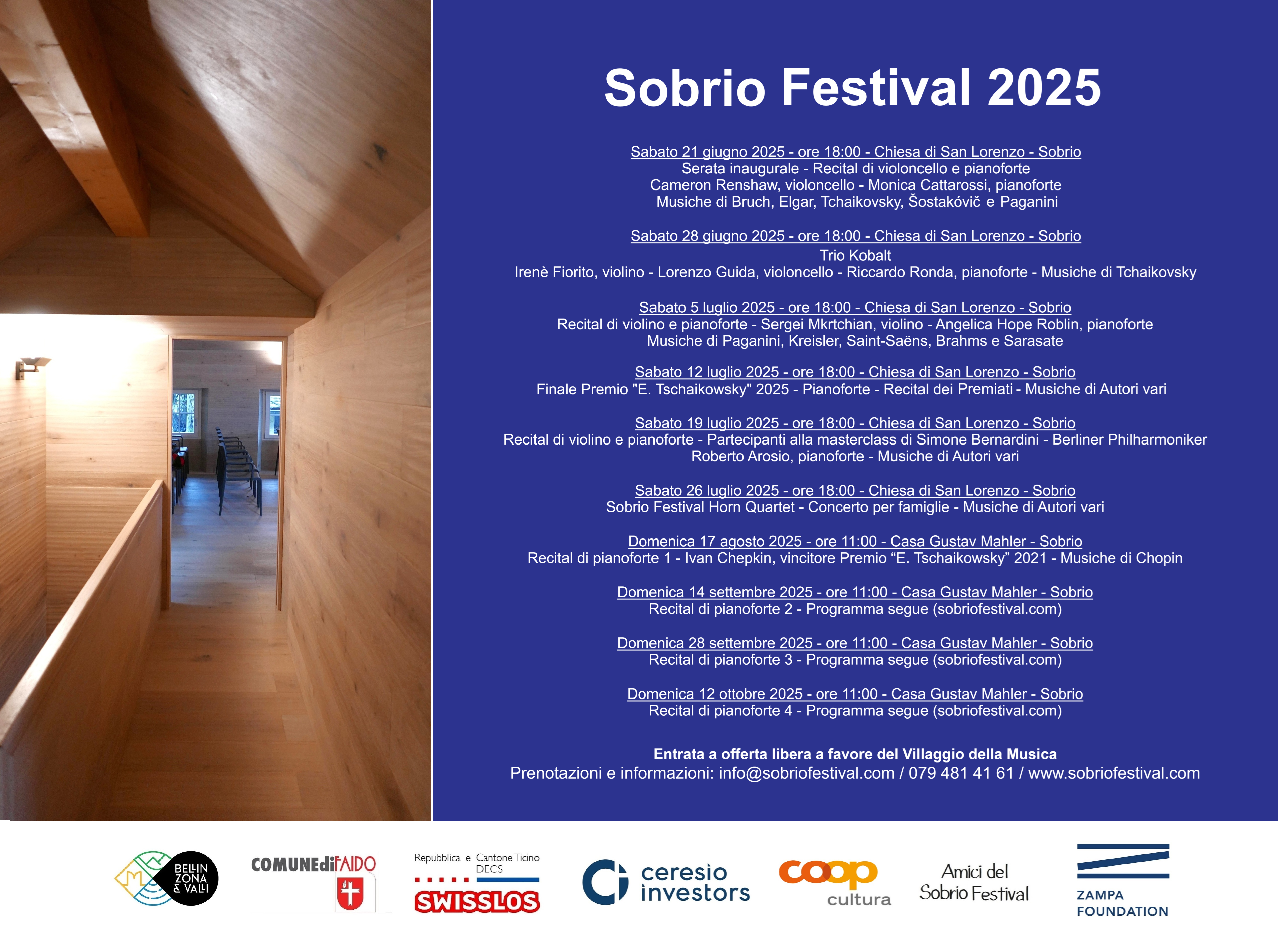Il Sobrio Festival 2026 presenta tante belle sorprese, grandi nomi e attesissimi ritorni. Tra questi, segnaliamo il recital del soprano Francesca Pia Vitale – reduce da trionfali successi al Teatro alla Scala e all’Opéra di Parigi – sabato 20 giugno. Altro appuntamento imperdibile, il concerto del timpanista dei Berliner Philharmoniker Vincent Vogel, che avrà luogo l’11 luglio. Per questa occasione, il Festival ha indetto un concorso aperto a giovani compositori under 40: una composizione per timpani e violino che sarà eseguita da Vogel in prima esecuzione assoluta. Si tratta pure di una prima mondiale per questo tipo di formazione! Lo strepitoso filoBarocco inaugurerà il Festival sabato il 13 giugno, mentre il ritorno del pianista dodicenne Antonio Pavan è previsto per il 27 giugno. Dubutto a Sobrio per il flautista Alessandro Bennardo che potremo ascoltare sabato 4 luglio in duo con la pianista Angelica Roblin.